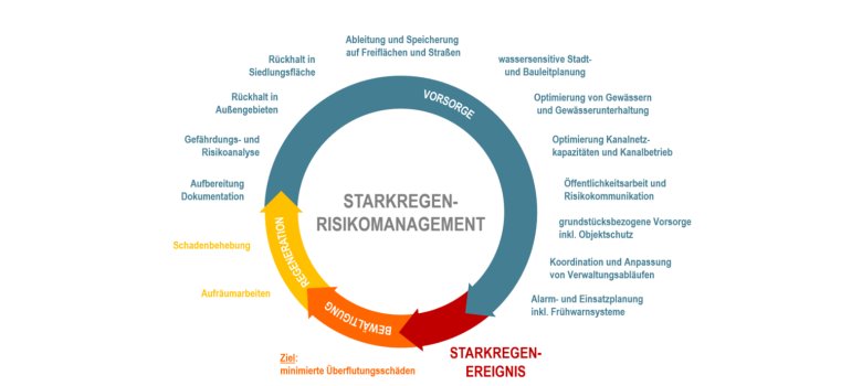 Zur Katastrophe mit hohen Schäden werden Hochwasser und Starkregen nur deshalb, weil in überschwemmungsbedrohten Flächen hochwassersensible Bebauung angeordnet wurde. Mauern und Deiche können ein Hochwasser nicht verhindern. Auch der Beherrschung von Sturzfluten sind aufgrund der enormen Wassermengen und der zur Verfügung stehenden kurzen Warnzeiten, enge Grenzen gesetzt. Nur durch ein umfassendes Risikomanagement kann eine Verringerung der Gefahren erreicht werden. Hierbei wird nicht nur ein aktuell ablaufendes Hochwasser- oder Starkregenereignis betrachtet, sondern auch die Zeiten zwischen den Ereignissen für die Vorbereitung von Abwehr- und Rettungsmaßnahmen genutzt. Die folgende Graphik zeigt, wie die Katastrophe, deren Bewältigung und Vorbereitung auf die mögliche weitere Ereignisse zusammenhängen.