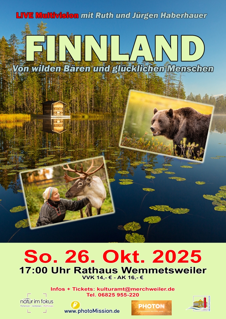 Unser Vortrag „Finnland – Von wilden Bären und glücklichen Menschen“ nimmt den Besucher mit zu den finnischen Naturschönheiten, in einsame Regionen dieses nur spärlich besiedelten Landes und hautnah zu kleinen Geschichten und großen Raubtieren.
